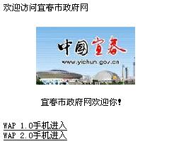 单击WAP2.0手机进入(目前,大部分手机都支持WAP2.0浏览器,而WAP1.0因为有许多局限且会有许多WAP功能无法使用,所以不推荐用WAP1.0手机进入)中国宜春无线网站首页(下图)。